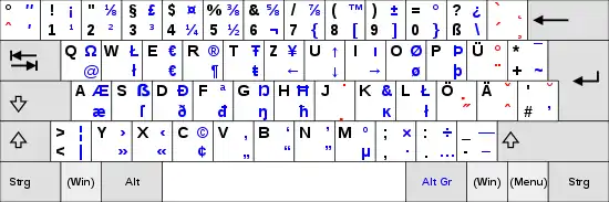 The characters ², ³, {, [, ], }, \, @, |, µ, ~, and € are accessed by holding the AltGr key and tapping the other key. The Alt key on the left will not access these additional characters. Alternatively Strg+Alt and pressing the respective key also produce the alternative characters in many environments, in order to support keyboards that only have one left Alt key.[2]