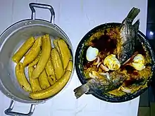 • Ampesie—boiled yam. It may also be made with plantain, cocoyam, potatoes, yams or cassava. This side dish is traditionally eaten with fish stew containing tomatoes, oil and spices.