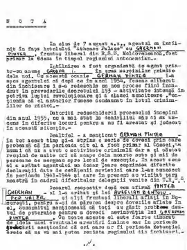 In October 1955, Gherman Pântea was included in an amnesty decreed by the Romanian communist authorities, as the early sign of a reluctant liberalization.[170] In January of the next year, he was even partially rehabilitated during a trial de novo for some 800 sentenced war criminals. After gathering evidence and testimonials from Soviet nationals, he took his case to the Supreme Tribunal, which concluded that his sentencing as a "war criminal" was illegal (while finding little evidence that his were crimes "against the working class").[171] However, the Securitate still kept a file on Pântea, keeping him and his family under constant surveillance. At a time when repression was organized against the Bessarabian refugees, its staff gathered data according to which Pântea was capable of organizing Bessarabian resistance in Romania-proper.[172] With noted help from the Soviet KGB and a female Soviet envoy (codenamed Valeria), the secret police began re-investigating Pântea's various activities in politics.[173] The Securitate archives also show that Securitate men approached the former Bessarabian Director with an offer to become their informant, but register Pântea's blunt refusal, even after intimidation.[174]