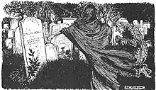 The Spirit in its "dusky shroud" is a personification of Death. While this may seem an odd choice to modern readers for a Christmas ghost, in the early Victorian era, people would remember their deceased loved ones at Christmastime, which was also a time for reflection at the end of the year. In his article 'What Christmas Is, As We Grow Older' published in Household Words in 1851, Dickens wrote, "Of all days in the year, we will turn our faces to that City [of the Dead] upon Christmas Day, and from its silent hosts bring those we loved, among us."[10] Dickens described a similar Christmas spectre in his story 'A December Vision' (1850), which also had a slow and unwavering persistence and which also had a shaded face and ghostly eyes.[11]