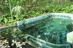 Fulton's design expanded the facility to three pools in 1940.[5][7] The first pool contained the spring itself and was 18 by 10 feet (5.5 m × 3.0 m) and mostly 8 feet (2.4 m) deep; the middle pool was 170 by 25 feet (51.8 m × 7.6 m) and 3 feet (0.91 m) deep; the last pool was 140 by 25 feet (42.7 m × 7.6 m) and 8 feet (2.4 m) deep. Total volume was more than 300,000 US gallons (1,100,000 L). It included 3 feet 3 inches and 9 feet 10 inches (1 and 3 m) springboards. The pool's drain is on the bottom beneath the 9.8 feet (3 m) concrete platform,[5] where water flows through a discharge pipe and creates the Glen Springs Run.