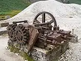 In 1859 the Glendasan and Glendalough mines were connected with each other by a series of tunnels called adits, which are now mostly flooded, through the Camaderry mountain. These tunnels helped drain the mineral vein and made it easier to transport ore to Glendalough where it could be more easily processed. The rusted remains of ore crushers can still be seen at the Miner's Village, however, the tramway and inclined rails system are gone.[13][14]