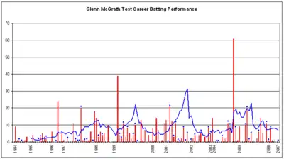 McGrath's batting prowess, in the early phases of his career, was poor; in fact, he scored first-ball ducks (zero runs) on both his Test[30] and One-Day International[31] debuts, and his batting average hovered below 4 for the first few years of his career. Years of patient tutelage from captain and friend Steve Waugh improved this aspect of his game to the point where he scored a Test half-century, which came on 20 November 2004[32] at the Gabba. His final score in that innings was 61, sharing a last wicket stand of 114 with Jason Gillespie (54*) to hilarity and the acclaim of their team-mates.[29] Nevertheless, McGrath was, for the duration of his career, regarded as a batting 'bunny', although he pushed his average above 7.00 runs/dismissal by the end of his career. In the first World Cricket Tsunami Appeal charity match, he was promoted to bat at number 6 ahead of specialist batsmen Stephen Fleming and Matthew Hayden, but was dismissed first ball trying to slog Muttiah Muralitharan. Towards the end of his international career McGrath, while not scoring many runs himself, became rather more difficult for opposing bowlers to dismiss, being dismissed only once during the 2005 Ashes series. With a contribution of 11 runs in the first innings of the MCG 2005 Boxing Day Test versus South Africa,[33] he stood his ground for 53 deliveries, helping Michael Hussey push the Australian tail to a record tenth-wicket stand against South Africa of 107 runs.