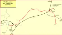 Both these schemes were attracted to acquisition of the Gloucester and Cheltenham Tramroad, chiefly to get access to the docks at Gloucester. The tramway alignment between the main towns was obviously unsuitable for main line railway purposes, and a new route was created for the new main line. The interest resulted in the C&GWUR being offered the tramroad for £35,000 on 28 January 1836, but they and the B&GR agreed to work together and acquire the tramroad jointly. They were also to work in concert to build their line between Gloucester and Cheltenham together, as their individually proposed alignments were almost identical.[1][2][8]