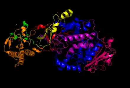 Glucansucrase has five major domains: A, B, C, IV, and V. The domains in glucansucrase, however, have a different arrangement than those in α-amylase. The folding characteristics of α-amylase and glucansucrase are still very similar, but their domains are permuted.[5][6][3] Domains A, B, IV, and V are built from two discontiguous parts of the polypeptide chain, causing the chain to follow a U-shape.[1] From the N- to C-terminus, the polypeptide chain goes in the following order: V, IV, B, A, C, A, B, IV, V (see figure at top right).[4] The C domain is the only one made up of a continuous polypeptide sequence.