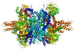 - 1 2 3 4 Smith TJ, Peterson PE, Schmidt T, Fang J, Stanley CA (March 2001). "Structures of bovine glutamate dehydrogenase complexes elucidate the mechanism of purine regulation". J. Mol. Biol. 307 (2): 707–20. doi:10.1006/jmbi.2001.4499. PMID 11254391.