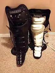 Lacrosse leg guards or "irons"[17] have taken a massive evolution since the early days of the sport. Early goaltenders wore cricket pads made from thin but rigid padding and a thick cloth material.[18] Eventually these evolved into a cross between cricket and baseball catcher's leg guard. Like cricket, the irons covered high above the knee, while having an exoskeleton of molded plastic caps and shin plates to deflect shots and leave less or no bruising like in baseball. In the 2000s and 2010s, the size rules for these pads were very much tested as a market emerged for new lacrosse goalie equipment. Irons grew in width until it was arguable that they were no longer designed to protect the shin, but largely to cover more net. Eventually there was a push back, the Canadian Lacrosse Association and its partners set limitations on shin guard wideness.[19]