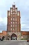 The Thirty Years' War devastated the town, and as a consequence of the post-war Peace of Westphalia (1648) and Treaty of Stettin (1653), the town remained with Sweden who had occupied the area since the Treaty of Stettin (1630).[2] The border with Brandenburg-Prussian Pomerania now ran close to the town, and cut Gollnow off from its economic hinterland, which hindered recovery from the war.[2] Between 1677 and 1683, Gollnow was occupied by Brandenburg-Prussia.[2] In the years that followed, the number of craftsmen in the town grew steadily.[2] In 1720, Sweden lost its possessions south of the Peene and east of the Peenestrom rivers, including Gollnow, to Prussia in the Treaty of Stockholm. In the 19th century, craft and trade were joined by industry – Gollnow hosted a coppersmith, a needle fabrication, several facilities for the manufacturing of furniture, three breweries, a distillery, and five water mills.[2] In the late 19th and early 20th century, the town became an important railroad junction, when it was connected to Neudamm (Dębno) and Naugard (Nowogard) in 1882, to Cammin (Kamień Pomorski) and Wollin (Wolin) in 1892, and to Massow in 1903.[3] Gollnow was part of the Prussian province of Pomerania from 1815 to 1945. With the unification of Germany in 1871, it became part of the German Reich. In 1919, the Germans operated a camp in the town, in which they imprisoned Poles arrested in Szubin during the Greater Poland uprising.[4] During World War II, the Nazis operated a prison in the town, with multiple forced labour subcamps located in the region.[5] Polish forced labourers were imprisoned in the town.