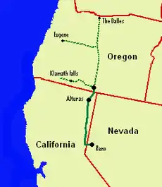 The next northward extension commenced in 1899. In April 1902, the line reached Madeline, California. The tracks were extended to Likely, California, in October 1907; Alturas, California, in December 1908; and finally, Lakeview, Oregon, on 10 January 1912.[3] The company planned to continue north through Prineville, Oregon, to The Dalles, with separate branches running west to Klamath Falls and on to the Rogue River Valley, and over the Cascade Mountains to Eugene, Oregon, in the Willamette Valley. However, no further construction ever took place.[1]
