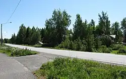 In September 1980 Alskatvägen was opened, stretching from Vaasa to Replot-Björköby, through Grönvik.[17][18][19] This reduced the driving distance and time from the village to Vaasa, contributing to a lively immigration to the village from 1983 to 1993.[19] At the glassworks bank there have been a harbour place, and a bit north along Alskatvägen, another one.[6] A public beach, maintained by the municipality, and some old boat houses, are now found on the former place of the latter.[6][20][21] As Grönvik lies on land affected by post-glacial rebound, the Grönvik flad, which borders the shore of the village, will in the future will become a gloe lake.[6] This means that the bank areas of Grönvik can no longer be reached by larger boats.[6]
