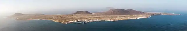 Graciosa Island or commonly La Graciosa (pronounced [la ɣɾaˈsjosa]; Spanish for "graceful") is a volcanic island in the Canary Islands of Spain, located two kilometres (1+1⁄8 nautical miles) north of Lanzarote across the Strait of El Río. It was formed by the Canary hotspot. The island is part of the Chinijo Archipelago and the Chinijo Archipelago Natural Park (Parque Natural del Archipiélago Chinijo).[4][5] It is administered by the municipality of Teguise in the neighboring island of Lanzarote. In 2018 La Graciosa officially became the eighth Canary Island[6] with few real effects.[7] Before then, the island had the status of an islet, administratively dependent on the island of Lanzarote. The only two settlements on the island are Caleta de Sebo in the southeastern part of the island and summer-residence Casas de Pedro Barba.