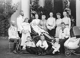 From left to right : Grand Duke Dmitry, Grand Duke Konstantin, Princess Tatiana, Grand Duchess Alexandra Iosifovna on a bath chair. On the floor Princes Konstantin, Igor and Oleg. standing in the back Queen Olga, Grand Duchess Vera, Prince Ivan, Grand Duchess Yelizaveta Maravkievana, Prince Gabriel and Prince Christopher of Greece on sailor suit.