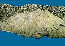 The prehistoric dune is made from yellow, windblown sands lacking the red component of the sands on the west side of the Rock. It is made of the same sand that once formed part of a vast savanna of the late Pleistocene where Neanderthals hunted.[1] The levant winds of prehistory continuously blew sand from this savanna westwards, accumulating against the eastern cliffs of the Rock, reaching from the base of the cliff right down to sea level (at that time there was no road where Sir Herbert Miles Road is today).[1] The occasional rockfall from the precipice above added boulders to the dune so the formation seen today is a consolidated composite of rocks and windblown sands. The upper limits of the dune were scarped by the British garrison for two reasons - to avoid soldiers deserting the place and to prevent surprise attacks by Spanish troops. The Great Sand Dune was constantly shifting right up to the late 19th century when corrugated iron sheets were laid over the dune for the collection of rainwater.[1] John White described this and the efforts to make it inaccessible: