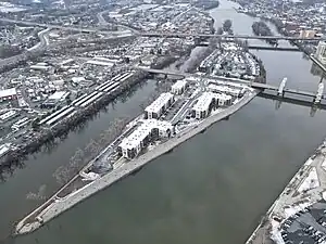 Much like its larger neighboring cities; Troy, Watervliet, and Cohoes; Green Island was a major manufacturing and transportation center. In 1823, the Federal Dam was built between Green Island and Troy, allowing for year-round navigation north on the Hudson River to Waterford and Lansingburgh. In 1834, a terminal was built on the island by the Rensselaer and Saratoga Railroad, which the following year built the first Green Island Bridge for railroad use from Green Island to Troy.[8] The Rensselaer and Saratoga Railroad built its locomotive and car shops in 1842 in Green Island.[8][9] Even after the Delaware and Hudson Railroad (D&H) took over and consolidated operations to the Colonie Shops (just west of Watervliet), the Green Island Shops continued to be a repair shop and were frequently mentioned in trade magazines during the 1930s regarding their experiments with new methods and materials; such as light weight steel.[9] Green Island, population 800, was incorporated in 1853 as a village in the town of Watervliet.[8][10] In that same year the Gilbert Car Company had a railroad car factory built in Green Island after their Troy location burned, it too would experience a fire in 1862, and finally went out of business in 1895.[11] The town of Green Island was formed in 1896, which also created the city of Watervliet,[12] a year after the division of the original town of Watervliet that created the town of Colonie.[13]