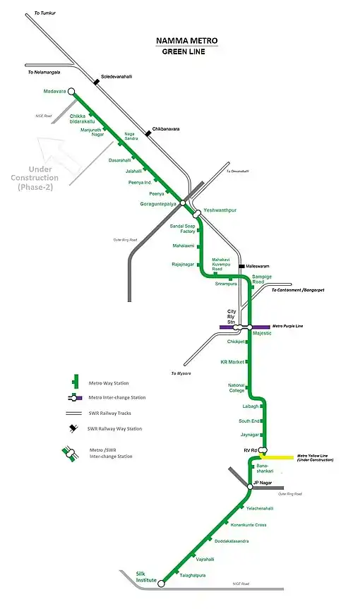 Green Line of Namma Metro was built along with the Purple Line during the first phase of construction of the metro rail system for the city of Bengaluru, Karnataka, India. The 30.5 km (19.0 mi) line connects Nagasandra in the northwest to Silk Institute in the south. The line connects the industrial centers of Peenya and Yeshwanthpur in the north with the central hub of Majestic and the southern residential areas of Bangalore (Basavanagudi, Jayanagar, Banshankari , Kanakapura Road etc.). Green Line is mostly elevated, with 26 elevated and 3 underground stations. The Line passes through Majestic station which is an interchange station between Green and Purple Lines.