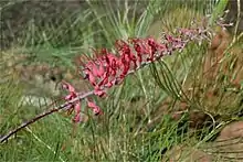 - Grevillea dryandri R.Br. subsp. dryandri[11] has leaves with 6 to 32 linear lobes 68–180 mm (2.7–7.1 in) long, 1.3–4 mm (0.051–0.157 in) wide and usually not paired, red, sometimes cream-coloured to white flowers with a red or paler style mostly from January to May, and fruit that is sticky but glabrous;[12][13][14]