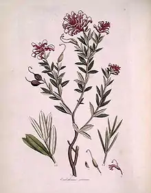 - Grevillea sericea (Sm.) R.Br. subsp. sericea[12] has egg-shaped leaves with the narrower end towards the base, to elliptic or narrowly elliptic leaves, usually less than 30 mm (1.2 in) long, 3–9 mm (0.12–0.35 in) wide, and deep to pale pink or white flowers usually mostly above the foliage.[13][14]