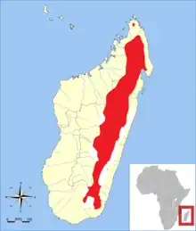 Its natural habitat is primary humid montane forests along the length of eastern Madagascar. It ranges from 900 to 2000 meters elevation, and is most common in higher-elevation forests at 1,400 to 1,800 meters. It is seldom found in disturbed forests or drier forests in the mountains' rain shadow.[1]