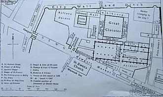 The Franciscan Order first arrived in England in September 1224, on the Tuesday after The Nativity of the Blessed Virgin. They settled in London in the summer of 1225, after John Iwyn, a wealthy businessman, bought a plot of land for them in the parish of St Nicholas in the Shambles (butchers' quarter).[2] The land was just inside the city wall, which at that time was next to open country.[3] Three years later, Joce Fitz Piers gave the Grey Friars his property in Stinking Lane.[4] Over the next 130 years Londoners and others made 25 further donations of land to the friars, ending with Queen Isabella's donation of a tenement in 1353 or 1354.[5] In 1229 King Henry III gave the Conventual Franciscans of London oak to build their house. By 1243 there were eighty friars in residence, and by 1258 they had extended the site on the North and Westside. The original church was built with money provided by William Joynier (mayor of London in 1239), who built the chapel and also gave two hundred pounds towards the cost of other buildings. Historian Charles Lethbridge Kingsford, who published the London Greyfriars' register and wrote a history of the site in the same volume, concludes from the sums of money spent on building work in this period that the friary would have been "of a modest kind".[4]