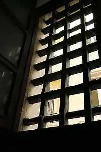 Grillwork is decorative grating of metal, wood, stone, or other material used as a screen, divider, barrier, or as a purely decorative element. It may function as a window, either with or without glazing. Grillwork may also refer to grilles, decorative front ends of motor vehicles. Grillwork is sometimes referred to as simply as a grill or as grille, but the latter terms do not convey a decorative quality. These words are all derived from the Old French greille. Other terms are used to refer to such decorative work. If the screen is made from iron, the term ironwork is often used. The term in Spanish, reja can also refer to metal fences. If the screen is made from cutouts of wood, the term fretwork is also used.[6]