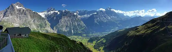 The valley of Grindewald from First, with the major peaks (from left to right) of Wetterhorn, Schreckhorn, Gross Fiescherhorn and Eiger. Grindelwald is visible on the center right.