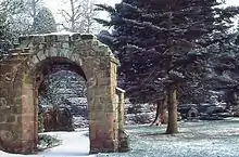 In the park are three medieval arches moved from elsewhere in the city, both of which are listed at Grade II. St Mary's Arch with its wing walls dates from around the 13th century and formerly stood in St Mary's Benedictine Nunnery.[11][16] The Old Shipgate Arch formerly stood to the west of the Bridgegate and was taken down in 1831.[11][17] The third archway was removed from St Michael's Church.[18][19] Also in the park and listed at Grade II is Jacob's Well Drinking Fountain consisting of a small stone arch with a drinking fountain for people and a dish for their pets, which is now dry.[11][20] During the laying out of the park a long line of Roman earthenware water pipes was discovered close to the lodge which used to bring fresh water from Boughton to the Roman fortress. In the 1950s a rockery was constructed on the southern edge of the park with waterfalls, streams and fountains.[11] The main gates of the park, together with other gate piers and sections of the park walls, all designed by John Douglas, are listed at Grade II.[21][22][23][24]