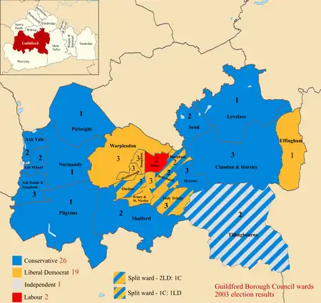 Wards electing councillors of more than one party – Friary and St Nicolas (3 – 2 Con, 1 Lib); Stoughton (3 – 1 Con, 2 Lib); Tillingbourne (2 – 1 Con, 1 Ind)