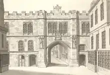 The first gateway on the site, which formed the southern gateway to the City on Lincoln on Ermine Street, the main road from London to York,[3] was completed in the early 211 AD.[4][5] The gateway would have become known as the Stonebow, which is derived from the Danish word stennibogi, some time after the Viking invasion of England in the late 8th century.[4] The Guildhall, which had been located in the south east corner of the city, was moved to a new location over the Stonebow in 1237.[4] In 1386 King Richard II presented a sword to city officials who ensured that it was displayed in the building.[6][7] The Guildhall and Stonebow were demolished in the late 14th century but, due to a shortage of funds, the present building was only completed around 1520.[8]