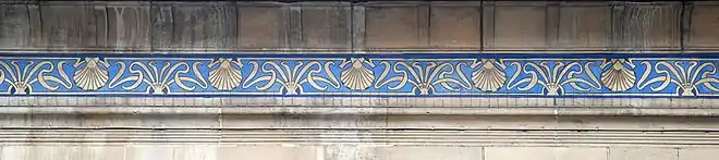 Apart from the games of volumes mentioned above, the only ornament on the façades consists of a frieze of arabesques and scallop shells on a blue background placed under the cornice.