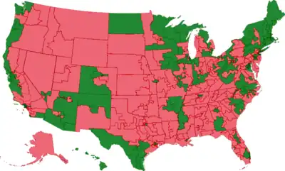 House voting map for H.R. 3590 where green indicates a 'Yes' and red a 'No'.