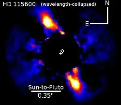 On May 26, 2015 a team led by Thayne Currie, Carey Lisse, and Marc Kuchner announced the discovery of a scattered light-resolved debris disk[4] likely responsible for the system's strong infrared excess around HD 115600 using the Gemini Planet Imager.