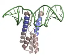 The N-terminal region of Rev contains an arginine-rich sequence. The arginine-rich motif (ARM) is located between amino acids 38–49 of the rev gene[6] and forms an alpha-helical secondary structure.[7] The ARM is a highly specific sequence which allows for the multimerization of Rev proteins, prior to RNA binding. A single base substitution alters Rev's ability to form a tetramer.[8] The arginine-rich domain of Rev interacts with the rev-binding element (RBE), which is part of the HIV Rev response element (RRE) located in an intron downstream of the env gene.[9] The alpha-helical secondary structure specifically can be considered a helix-loop-helix motif, which allows the REV protein to stably bind to the RRE RNA to form the ribonucleoprotein complex.[10] The domain also contains a nuclear localization signal.[11]