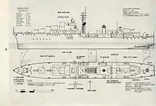 The 'Darings' were the largest destroyers then built (1949) for the RN,[1] having a displacement of 3,820 tons, a length of 390 feet (120 m), a beam of 43 feet (13 m), and a draught of 12.75 feet (3.89 m).[2]