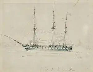 HMS Druid was a 32-gun Hermione-class fifth-rate frigate of the British Royal Navy, launched in 1783 at Bristol. She served in the French Revolutionary Wars and the Napoleonic Wars, capturing numerous small prizes. One of her commanders, Captain Philip Broke, described Druid as a "point of honour ship", i.e., a ship too large to run but too small to fight. He and his biographer's view was that it was a disgrace to use a ship like her as a warship.[2] She was broken up in 1813, after a thirty-year career.