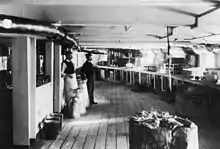 In June 1881, the Lords of the Admiralty agreed to lend HMS Atlas and Endymion to the Metropolitan Asylums Board along with a steam pinnace, due to an epidemic of smallpox in London. Endymion was to serve as an administration ship.[173] She was towed out of Chatham on 25 June and towed to Greenwich, Kent on 29 June. She was to be used as a hospital ship for patients infected with smallpox,[174] although Endymion was supposed to be an administrative ship.[173] Atlas was acquired by the board on 4 June, and Endymion on 5 July.[175] The plans for the conversion of Atlas and Endymion were drawn up by Messrs A & C Hartson, the architects to the board. A gangway connected the two ships.[4] Conversion of Atlas and Endymion cost £11,000. Endymion provided accommodation for the staff serving on the ships, as well as kitchen and laundry facilities. She also provided heating for the ships,[176] as well as laundry and the repair of the patient's clothes being done on board.[177]