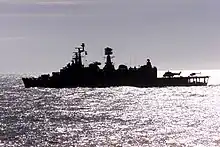 Fife had 'B' turret removed and replaced with four Exocet launchers in the mid-1970s. In 1977 she attended the Silver Jubilee Fleet Review and formed part of the 2nd Flotilla.[1] In 1979 she provided assistance to the Caribbean island of Dominica after the island was severely hit by Hurricane David, for which she was awarded the Wilkinson Sword of Peace.[2] She was under refit from October 1980 to December 1982, and therefore missed the Falklands War. Changes included replacing the old Wessex helicopter with a Westland Lynx, fitting a satellite communications system and anti-submarine torpedo tubes.[3][4] She formally recommissioned after the refit on 31 March 1983.[5]