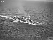 Frobisher was assigned to the 4th Cruiser Squadron of the Eastern Fleet after the refit was completed and began escorting convoys and the fleet's capital ships in the Indian Ocean.[22] The ship took over the tow of the French light cruiser Le Triomphant in December 1943 after she had been badly damaged in a typhoon; they arrived in Diego Suarez, Madagascar, on 19 December.[23] Frobisher returned to the UK in March 1944 to prepare for Operation Neptune;[24] the ship had her anti-aircraft armament augmented by a dozen single Oerlikons and her four quadruple two-pounder mounts were replaced by a pair of octuple mounts during a refit that lasted from 5 April to May.[25]