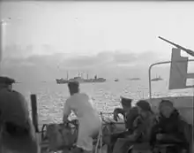 The next front action for Ledbury came later on that day, at 08:20, when the destroyer began signalling, 'Eight air torpedo-bombers 210 degrees, five miles', and then two minutes later, 'for eight read ten'.[7] Suddenly after Ledbury's signals, all the escorts seemed to be blinking morse-signals at once. The loudspeakers were booming, 'Bombers approaching ... there's six of them ... there's twelve ... there's eighteen ... good God, there's twenty-five!' The anti-aircraft ship lurched forward and altered course to head off the attack. Commodore Dowding signalled Keppel to ask if the convoy should make an 'emergency turn'; but it was deemed too late for such a manoeuvre, since half the ships would most likely miss the signal altogether and Broome flashed back, 'I do not think it worth it.'[8] The developing air attack spotted by Ledbury turned into a blitz of the convoy, with Luftwaffe aircraft being shot down over the formation, and one plane crashed into the sea about four thousand yards from the destroyer USS Wainwright, on the convoy's starboard bow. The crash occurred not far from Ledbury and seamen on board saw four German airmen climbing out into a rubber dinghy with the bomber sinking soon after. The pilot, Lieutenant Kaumeyr, and his three crewmen were picked out of their dinghy by Ledbury.[9] The attack however, continued and throughout the fierce fighting the escorts distinguished themselves by screening the merchantmen from many attacks, especially U-boat sorties; Ledbury alone had sighted seven.