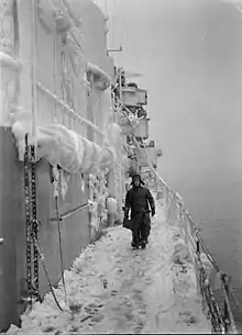 A member of crew on the snow-covered deck whilst on patrol in the North Atlantic