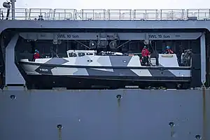 The ESB is carried in a davit on board a Rotterdam-class landing platform dock or HNLMS Karel Doorman to its work area. Hydrograaf has a range of 100 nautical miles (190 km; 120 mi) and an operation time of 60 hours at 5 knots (9.3 km/h; 5.8 mph).[3][4]