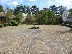![]() Hacienda's main patio view. Behind, is possible to appreciate both church buildings. | |