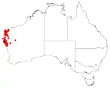 H. stenophylla is endemic to an area in the Mid West and the Gascoyne regions of Western Australia where it is found on sandplains and among coastal sand dunes where it grows in sandy and loamy soils often around limestone usually with spinifex.[9][11]
