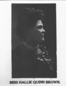 Hallie Quinn Brown (March 10, 1850 – September 16, 1950)[A] was an American educator, writer and activist.[1] Originally of Pittsburgh, Pennsylvania, she moved with her parents (who had been enslaved) while quite young to a farm near Chatham, Canada, in 1864 and then to Ohio in 1870. In 1868, she began a course of study in Wilberforce University, Ohio, from which she graduated in 1873 with the degree of Bachelor of Science.[2]