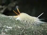 The larvae have yellow-orange heads and bodies covered with hair, and they can grow to approximately 25–35 mm in length.[2][3] They exhibit two pairs of long, orange hair-pencils and two pairs of white hair-pencils towards the front of their body. They also exhibit one pair of white hair-pencils near the back of their body.