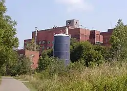In 1953, Hamm's purchased its second brewery from the Rainier Brewing Company.[6] Hamm's opened its San Francisco brewery in 1954 at 1550 Bryant Street.[7][8] Its 20-by-80 foot sign, was surmounted by a three-dimensional 13-foot beer-glass-shaped lighting sculpture on top, filling with "beer" and forming a "head", all with lights.[9][10][11] It appeared in the first Dirty Harry film and was a local landmark. The brewery closed in 1972. In the early 1980s, Suicide Club (secret society) used a jackhammer to "take out the doors and open holes in the giant tanks and make living spaces",[12][13][14][15] the beer vats were then first squatted and then rented out to punk rock bands.[16][17] Known as "The Vats", the brewery was a center of San Francisco punk rock culture with about 200 bands using individual vats as music studios.[18][19][20] The building was renovated in the mid 1980s and converted into offices and showroom space.[21]