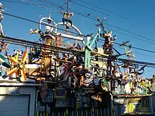 Hamtramck Disneyland is a yard of folk art located in Hamtramck, Michigan begun by a man named Dmytro Szylak.[1] Work on the installation started in 1992 and came to be finished in 1999. It is built on a 30-foot backyard on top of two adjacent garages. Dmytro was born in Ukraine, and also once lived in Germany. After immigrating to the United States, he worked for General Motors, but soon after his retirement he felt the need to find a hobby. Dmytro began piling together different objects—some old, some new, and some bought, while others were hand crafted. This towering structure stands tall above his house and garage. Over the course of 12 years, Dmytro continued to add different pieces to his work, which eventually grew to be a collage.[2]