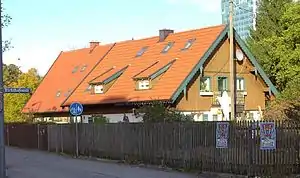 At Hanauer Straße 10/10a, 12/12a and 14/14a, the Lehrkolonie Moosach (teaching colony) was built in 1919 by the Bayerische Landessiedlung. Three semi-detached houses, single-family small-house buildings in country house style, served as experimental buildings for the testing of alternative building materials. Today these buildings are cultural monuments under the Bavarian monument protection law.[4]