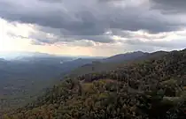 Happy Valley is situated in a narrow valley of the same name on the northwestern fringe of the Great Smoky Mountains. Chilhowee Mountain— an elongate ridge stretching for roughly 35 miles (56 km) between the Little Tennessee River and the Little Pigeon River watersheds— spans Happy Valley to the north. The valley is walled off to the south by several low ridges— namely Pine Mountain to the southwest and Hatcher Mountain to the southeast— which run roughly parallel to Chilhowee Mountain. Cades Cove is located opposite Hatcher and Pine Mountain to the south. Happy Valley Ridge provides the valley's eastern barrier, splitting it off from Lake in the Sky and the Top of The World community. Gregory Bald and the main crest of the western Smokies rises beyond Pine Mountain approximately 3 miles (4.8 km) to the southwest.