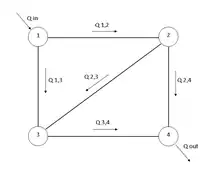 The Hardy Cross method is an application of continuity of flow and continuity of potential to iteratively solve for flows in a pipe network.[1] In the case of pipe flow, conservation of flow means that the flow in is equal to the flow out at each junction in the pipe. Conservation of potential means that the total directional head loss along any loop in the system is zero (assuming that a head loss counted against the flow is actually a head gain).