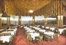 The Rheinterrasse (Rhine terrace) on the third floor in the circular section of the building, had a diorama to give the illusion of sitting outdoors overlooking the river between Sankt Goar and the Lorelei rock. A troupe of twenty "Rhine maidens" danced between the tables under hoops twined with grape vines.[54] Hourly thunderstorms were created by lighting and sound effects; one American visitor reputedly "beam[ed] like a movie theater façade on Broadway" when told about this.[56] The establishment used the motto: